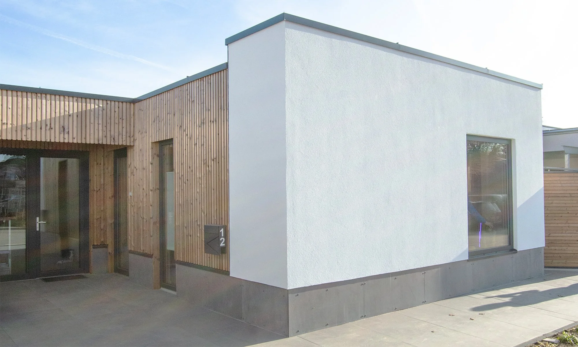 ● Gevelbekleding, thermisch gemodificeerd vuren door Lunawood en stucwerk.
